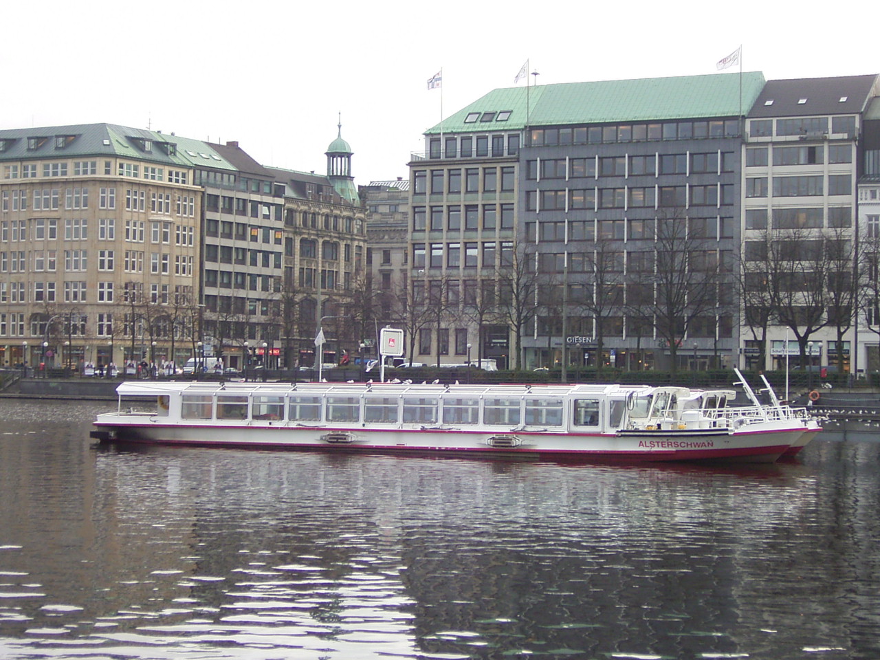 Der Alsterschwan fährt auf den Kanälen der Alster in Hamburg für die ATG Alster-Touristik GmbH